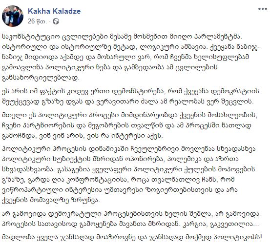 არ გამოვიდა დემოკრატული პროცესებისთვის ხელის შეშლა, არ გამოვიდა პროცესის სათავისოდ გამოყენება მავანთა მხრიდან. კარგია, გაკვეთილია. მადლობა ყველა ჯანსაღად მოაზროვნე და ჯანსაღად მოქმედ პოლიტიკოსს“, – წერს კახა კალაძემ.