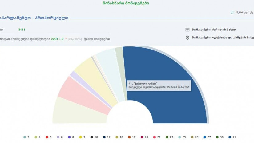 ცესკოს მონაცემების თანახმად, 2201 უბნის დათვლის შედეგებით „ქართულმა ოცნებამ” 52,97% მიიღო.